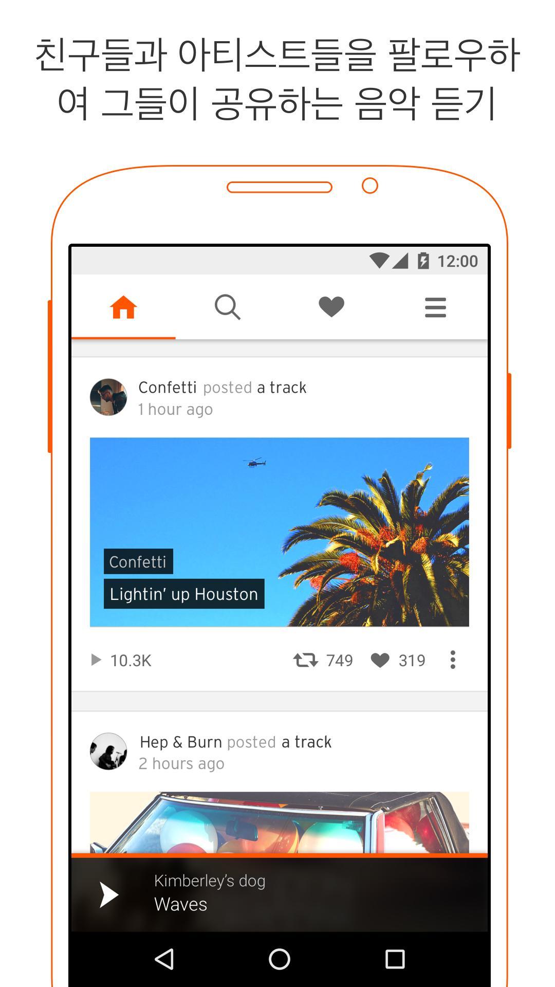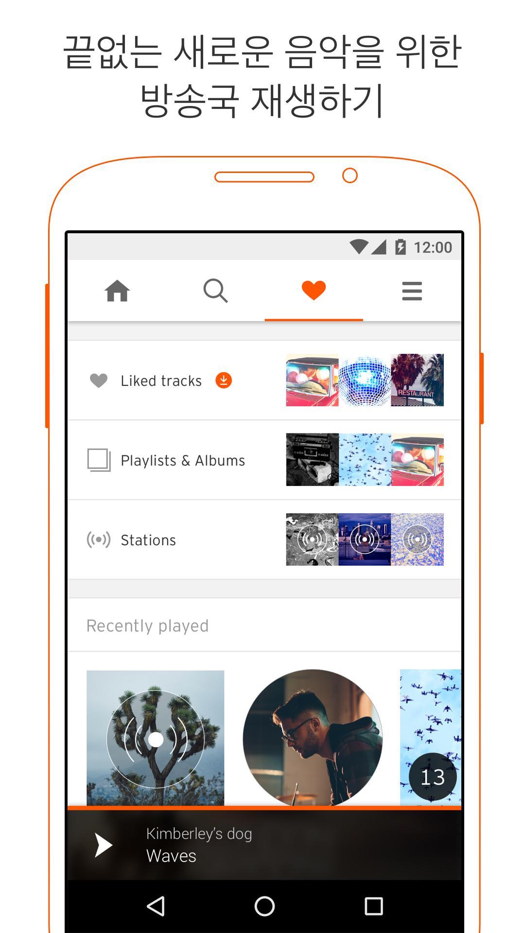 시작하기직접 참여하여 음악과 오디오를 쉽게 찾을 수 있습니다.탐색(Explore) 섹션을 이용하여 여러분이 생각하는 모든 장르의 최신 유행 음악과 오디오를 찾아보세요.탐색을 하면서 하트 그림을 탭하여 '좋아요'를 표시하면 나중에 재생할 수 있도록 즐겨찾기에 저장됩니다.검색(Search) 페이지에서 좋아하는 노래와 아티스트를 찾을 수 있습니다. 아티스트의 프로필을 팔로우하면 아티스트가 올린 새로운 음악을 스트림에서 들어볼 수 있습니다.http://help.soundcloud.com/customer/portal/topics/110297-mobile-apps/articles