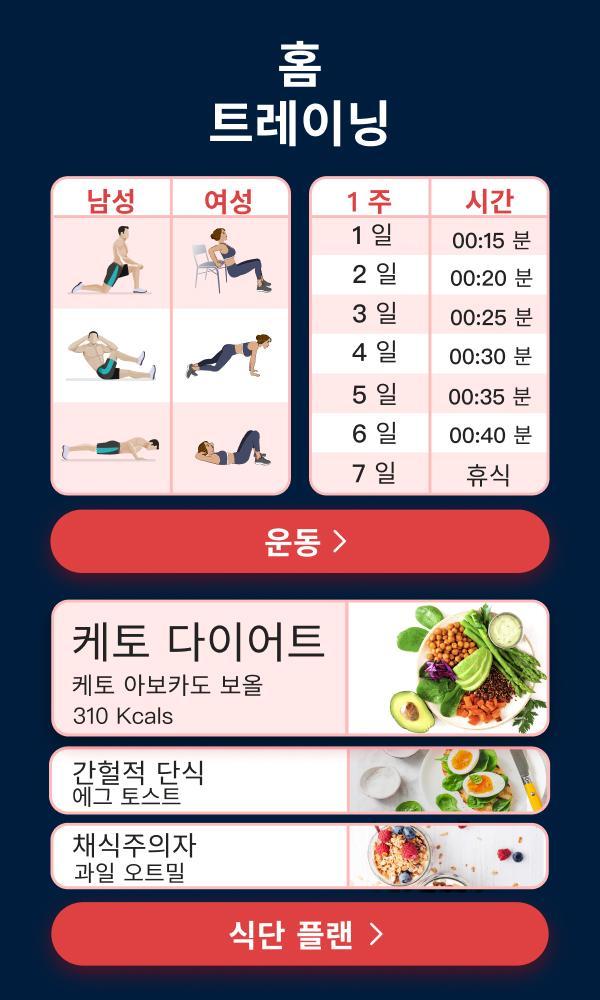 운동을 극대화하기 위해, BetterMe는 여러분의 식습관과 영양을 충족시킬 수 있는 다양한 균형 잡히고 실질적인 식사 플랜을 제공합니다. 또한 저희는 당신의 알레르기와 좋아하지 않는 재료들을 참고합니다.