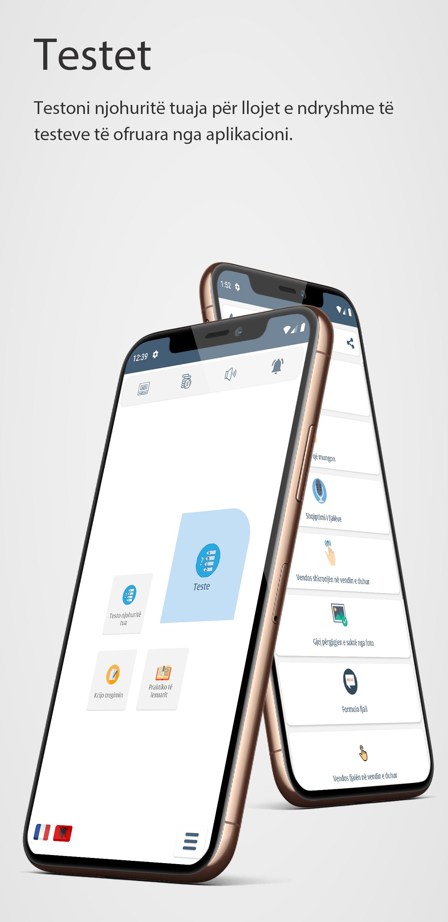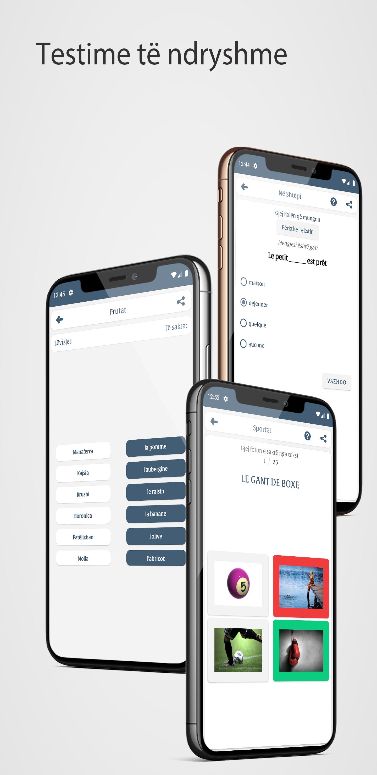Testoni njohuritë tuaja nga lloje të ndryshme të testeve të ofruara nga aplikacioni si: P.sh. kombinimi i fjalëve me të njëjtin kuptim, gjetja e përgjigjes së saktë nga foto, përkthimi i fjalës ose fjalisë, dëgjimi i fjalisë dhe më pas shkrimi i saj, shqiptimi i fjalisë që shfaqet dhe të tjera.